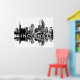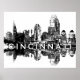 Esta trabalho de arte apresenta a linha do horizonte de Cincinnati, Ohio a tinta preta com seu próprio reflexo.
