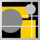 Retângulos amarelos, círculos de cinza, linhas brancas, fundo preto. #abstrato
