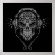 Este elaborado design do crânio do DJ pelo artista Jeff Bartels é decorado com intrincados espirais e padrões de pontos. Fones de ouvido sentados em cima do crânio com dois fios pendurados abaixo. Uma sombra cai sobre o fazer de fundo de malha circular que parece que o crânio está flutuando logo acima da superfície. Este dia agressivo da imagem inspirada nos mortos é perfeito para músicos e amantes da música.