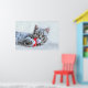 Uma poster com uma fotografia de Natal fofa de uma cinza de gato a morder um chapéu vermelho de santa. Suas grandes patas fofinhas tornam esta foto muito encantadora.