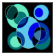 Padrão abstrato, colorido e geométrico, vários tons de círculos de interseção verdes e azuis sobre fundo preto