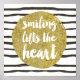 Esta glamourosa poster de citação inspiradora mostra a frase "Sorrir levanta o coração" escrita em bonito caligrafia e enquadrada por um círculo falso de folha de ouro. As listras de aquarelas brancas e pretas decoram o fundo.