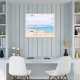 A tipografia "Seas the Day" escreveu uma citação na areia desta cena cativante de um barco de pesca pregado numa praia arenosa com aqua azul-aqua e céu ensolarado acima.