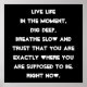 Poster de citação motivacional em preto e branco...Viva a vida no momento. Mergulhe fundo, respire devagar e confie que você está exatamente onde deveria estar agora. Inspiração, encorajador e afirmativo.