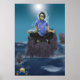 O personagem Kaito, elemento-d'água, da banda desenhada online TAOFEWA, é mostrado meditando sobre uma rocha cercada por água, com a lua brilhando no céu azul acima.