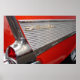 Foto de um carro clássico vermelho. Linhas elegantes e músculo sólido sob o capô.