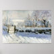 Uma pintura de Claude Monet representando uma pega sentada numa ponte coberta de neve.