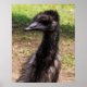 A detailed view of an emu's head and neck, highlighting its textured feathers and large, dark eyes. The background features a soft, natural setting.