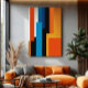 Esta peça abstrata apresenta blocos verticais em tons vibrantes de laranja, azul, preto e branco, criando uma composição harmoniosa e impressionante. Perfeita para espaços modernos, irradia energia e equilíbrio através da cor e da geometria.