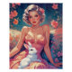 Uma ilustração espantosa de um alfinete num vestido cor-de-rosa floral, segurando um belo coelho branco. Seu penteado retrô, enfeitado com flores cor-de-rosa, complementa o luxuoso fundo floral em tons de rosa e lacrimejo, capturando o charme da Páscoa com elegância vintage.