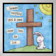 Um coelho branco reza ao pé da cruz de madeira sobre uma colina de grama sob um sol brilhante e caprichoso. As palavras parecem ser rasgadas das páginas de um livro e dizem "... porque tudo de bom e doce vem do Senhor...". Design original de Christie Black of ©Creations do Coração.