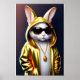 Legal com coelho branco humanoide vestindo um capuz amarelo ouro, corda do pescoço e óculos escuros.