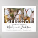 Dê as boas-vindas aos convidados do casamento na sua cerimônia ou recepção com um elegante cartaz personalizado de colagem de 3 fotos 18"x24". Imagens e todo o texto são simples de personalizar. (DICA DE COLOCAÇÃO DE IMAGEM: Uma maneira fácil de centralizar uma foto exatamente como você deseja é cortá-la antes de fazer o upload para o site da Zazzle.) O design moderno minimalista preto e branco apresenta três imagens de sua escolha, caligrafia estilosa de estilo manuscrito, tipografia vintage inspirada no art déco e mensagens personalizáveis que dizem "bem-vindos à celebração de casamento" e "obrigado por compartilhar nossa alegria". Este letreiro de casamento é uma maneira elegante de compartilhar fotos do noivado, ao mesmo tempo em que adiciona um toque pessoal às decorações do seu dia especial. Parabéns à noiva e