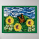 Representação de vidro detido de um campo de girassol visitado por uma borboleta monarca.