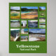 Colagem de fotos tiradas no Parque Nacional de Yellowstone (incluindo a Velha Fé, a Piscina da Glória Morning, o Rio Madison, o Grande Primavera Prismático, o Boné da Liberdade, os Primaveras Quentes de Mammoth e as Quedas Superiores do Yellowstone).
