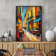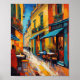 Bring the charm of European café culture into your space with this vibrant street scene artwork. Warm tones of yellow, orange, and red highlight the lively buildings, while rich blues and dynamic brushstrokes capture the cobblestone street and bustling atmosphere. Outdoor tables and strolling figures evoke a sense of community, leisure, and everyday joy. Perfect for travel lovers, Francophiles, or anyone who enjoys cozy, welcoming spaces, this poster adds bold color along with a touch of whimsy and warmth to kitchens, dining areas, or living rooms. It’s a celebration of color, culture, and the simple pleasures of café life.
