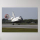 Com a calha de arrasto descontinuada, a descoberta do ônibus espacial pousa na pista 33 no Shuttle Landing Facility no Kennedy Space Center, na Flórida, em destaque com Cape Canaveral.
