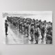 Mulheres da Segunda Guerra Mundial em uniformes e máscaras de gás alinhadas para inspeção. Foto do dominio público preto e branco.