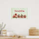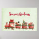Um poster com uma imagem fofa e adorável feita com aquarelas. Papais noeis que conduzem um trem cheio de brinquedos para todas as crianças do mundo.