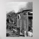 Um design fotográfico preto-e-branco de antigos comboios a vapor ferrugem, aguardando restauração.