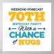 Palavra especial de aniversário de 70, decorativa e colorida, dizendo com frase engraçada como Festa de aniversário de 70 de Previsão de Fim de Semana com Mudança de Abraços. Feliz aniversário de 70 para celebrar o aniversário de seus entes queridos, por exemplo, sua avó, avô, pai, mãe, tio ou tia. Feliz ideia de presente de 70.