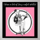 Loira com pernas longas e saltos altos sentados em cadeira pronta para tomar a ditadura. "Eu tenho muitas habilidades muito úteis!" As cores são rosa e pretas