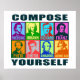 As cores brilhantes acrescentam um espírito moderno de pop a estes retratos estilizados gráficos de compositores musicais famosos. Cada retrato é desenhado com duas cores intensas diferentes e tem o primeiro nome do artista colocado abaixo em uma fonte arrojada e limpa. São apresentados oito compositores: Chopin, Bach, Wagner, Schubert, Tchaikovsky, Shostakovich, Mozart e Beethoven. Por cima e por baixo dos retratos, em negrito tipo carvão, estão as palavras "Componha-se". Apanhar os olhos, contemporâneo e único!