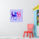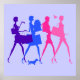 Quatro silhuetas de mulheres caminhando seguidas com sacos e caixas de compras, cada uma com uma cor diferente, rosa, rosa quente, azul e roxo.