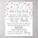 Não diga placa de jogo da noiva pôster para chuveiro de noiva em padrão de confetes rosa e prata. Por favor, note que o efeito de brilho é apenas efeito fotográfico.