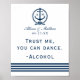 Costume náutico temido "Confie em mim, você pode dançar. poster / sinal de álcool a apresentar na recepção de casamento de Verão. Texto personalizado azul marinho e cor branca de fundo. Personalize a âncora do barco com design de monograma de corda com nozes e noivas, nomes e data do casamento. As faixas horizontais destacam o design.