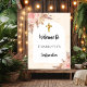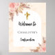 Ouro, impressão de mármore colorido de pêssego como fundo decorado com uma cruz de ouro, grama-pampas e flores cor-de-rosa escamoteadas e um quadro em forma de arco branco. Personalize e adicione um nome.