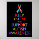 Mantenha a calma e apoie a consciência do autismo. Versão autista de Manter Calmo e Carregar em poster motivacional com fita de autismo e texto em cores vívidas do espectro do autismo.