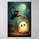 Cena de Halloween com fantasma e gato preto.