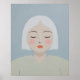 Esse retrato minimalista apresenta um rosto estilizado com uma expressão calma e meditativa. A mulher tem cabelo branco molhando um rosto pálido com bochechas rosadas e lábios de coral. Olhos fechados, a figura exumenta uma sensação de paz interior e tranquilidade. Colocada sobre um fundo de cinza azul macio, a paleta de cores muda e as linhas limpas criam uma estética moderna e suave, adicionando um toque de dúzia.