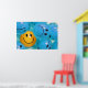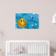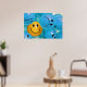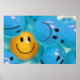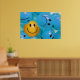 Um poster inspirador representando uma bola amarela sorridente num mar de bolas azuis franzidas e representando a importância de manter um senso de otimismo e humor.