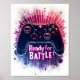 Controlador de consola de jogos de vídeo pronto para a batalha - Um controlador de consola preto está representado num design vibrante e estilizado. O controlador está posicionado frente e centro, com um esquema de cor rosa e roxo dominando o fundo. O fundo apresenta um padrão circular de linhas radiantes, reminiscente de uma explosão solar, com placas de cor criando uma sensação dinâmica e energética.