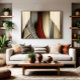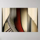 Uma composição abstrata fascinante que explora a tensão entre linhas retas e curvas fluidas. Listras verticais em tons de vermelho, dourado e preto criam um ritmo visual dinâmico, enquanto formas geométricas curvas atravessam a composição, gerando profundidade e movimento. A obra de arte brinca com perspectiva e ilusão óptica.