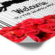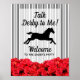 O sinal de boas-vindas do partido Derby poster apresenta uma silhueta de cavalo de corrida, listras e rosas vermelhas negras e brancas, Fale comigo Derby com os detalhes do seu partido em letra chic. CORRESPONDENTE a itens na nossa coleção.