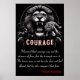 Coragem desencadeada é representada nesta imagem em preto e branco de alto contraste. Um leão feroz ruge, uma mostra de energia bruta, enquanto um pequeno filhote de tigre sobe em suas costas. O fundo escuro enfatiza os sujeitos. "Coragem" é escrita em negrito, elegante e vermelho numa caixa de texto estilizada abaixo. A citação de Nelson Mandela reforça o tema: "Aprendi que a coragem não era a ausência do medo, mas o triunfo sobre ele. O homem corajoso não é aquele que não sente medo, mas aquele que conquista esse medo." A imagem inspira força e coragem.