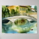 Poster artístico apresenta uma cena de aquarela digital gerada por IA de uma bela cidade europeia com uma ponte arqueada sobre um canal.