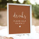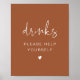 Este sinal de bebidas apresenta fontes manuscritas e um design moderno minimalista combinado com uma combinação boho terracotta e cor branca. Use este poster para sua recepção de casamento, chá de panela, festa de aposentadoria, etc. Edite o texto *maioria* para atender às suas necessidades.
