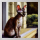 Gatos viveram ao lado do homem por milênios. Mostre ao mundo a sua paixão por gatos com este retrato de um Cornish Rex numa varanda. Excelente para todos aqueles amantes de gatos lá fora.