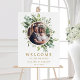 Este sinal de boas-vindas de casamento apresenta eucalipto aquarela pintada, folhas verdes e uma foto com uma moldura de círculo dourado. Para personalização mais avançada deste design, clique no link "Personalizar ainda mais". Itens correspondentes também estão disponíveis.