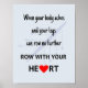 Todo remador sabe que quando suas pernas estão em agonia, seu corpo gritar "Pare!" mas seu cérebro diz "Não! A corrida ainda não acabou!" É o momento de cavar fundo e remar do seu coração. Inscrição em preto sobre fundo azul pálido com a silhueta esmaecida de um oito remando.