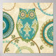 © Verique Charron / Wild Apple. Uma imagem padronizada de uma coruja com padrões circulares. Há também um fundo floral colorido brando na imagem.