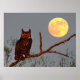 Esta incrível foto da SuperStock apresenta uma Coruja-de-chifres empoleirada em frente a uma lua cheia.