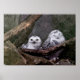 Corujas bonitas de neve sentadas entre árvores e pedras, efeito aquarela.