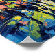 Poster de qualidade colorida e de excelente com "A seguir" - uma paisagem urbana de abstrato que inclui cores vibrantes de verde limão, tons de azul, com um toque de amarelo e coral. As ruas estão repletas de pedestres e os céus cheios de corvos. copyright 2025 Joco Studio