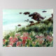 Uma vista da costa acidentada de Mendocino, Califórnia, com ervilhas-doces rosa brilhante em flor, desenhadas à mão e pintadas com aquarela. Gosto de fazer desenhos e pinturas de lugares que visitei e realmente gostei. Além disso, a área foi filmada para "Murder, She Wrote", da qual sou uma grande fã.