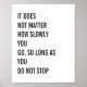 Posters motivacionais com citações, de inspirational_sayings, com citações famosas de Confucius, com as palavras, em preto e branco, "não importa quão devagar você vá, contanto que você não pare" (texto alinhado à esquerda). Esta poster inspiradora é sobre pegar coisas aos poucos, até atingirmos nossos objetivos. Crie facilmente o seu poster de aspas ou personalize posters inspiracionais com as suas cores, tipos e citações de vida favoritas.